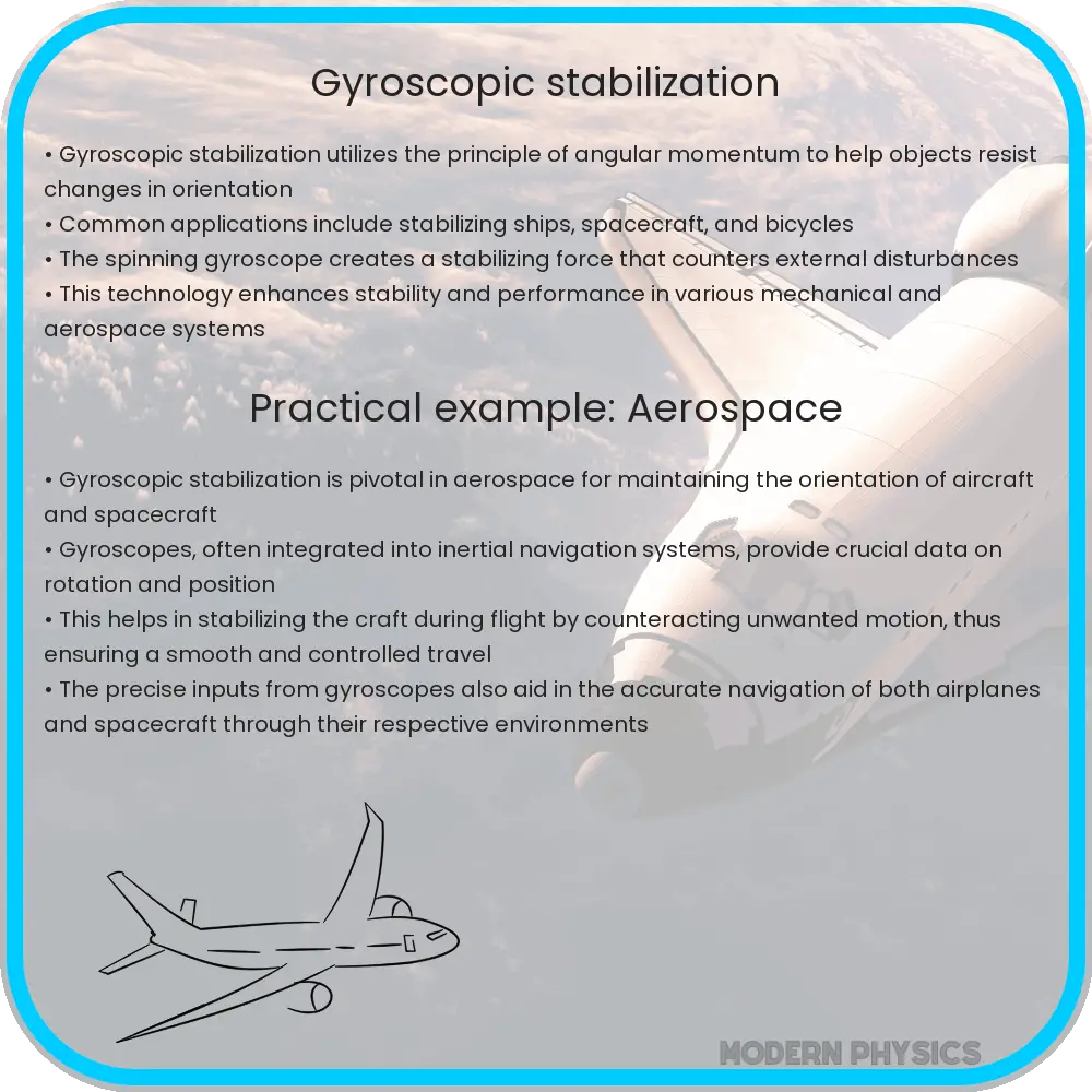Gyroscopic stabilization is a physics and engineering principle aiding orientation in devices like smartphones and spacecraft, based on angular momentum conservation.